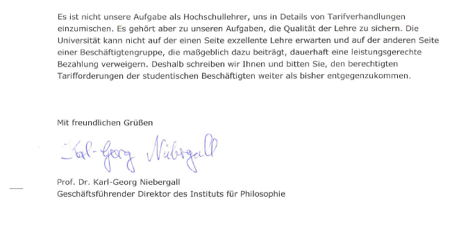 In diesem Brief stellen sich die Professor*innen hinter unsere Forderung nach einer fairen und zeitgemäßen Vergütung. Zudem thematisieren sie die überfüllten Tutorien, welche gute Lehre kaum möglich machen. Doch lest selbst: